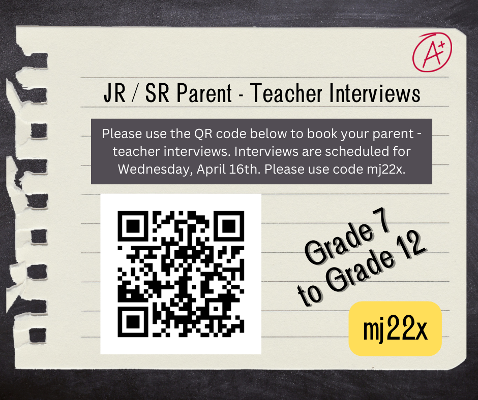Back to all posts Posted on April 9 2025 JR/SR Parent - Teacher Interviews Jr/Sr Parent - Teacher Interviews Please use the following link or QR code to book your parent - teacher interviews for your Jr and Sr high students. Interviews are being held on Wednesday, April 16th. The booking code is mj22x. schoolinterviews.ca Jr/Sr Parent - Teacher Interviews Prev Post Next Post